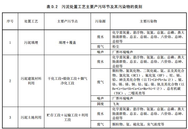 D.3 污泥處置工藝主要產(chǎn)污環(huán)節(jié)及其污染物的類別,見表D.2。