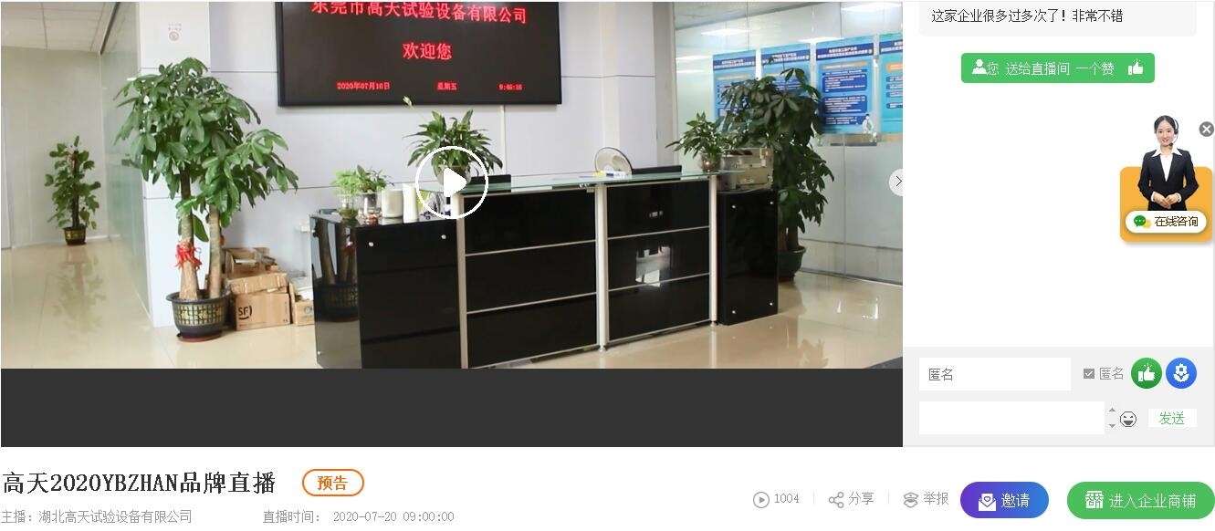 本次直播高天將為大家?guī)砝錈釠_擊試驗箱、振動臺、恒溫恒濕試驗箱等公司主打產(chǎn)品的講解,想了解更多試驗儀器知識請鎖定高天直播間!