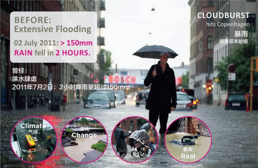 2010年8月與2011年8月,哥本哈根市在兩年內(nèi)接連遭受了三次毀滅性的暴雨襲擊。從統(tǒng)計(jì)數(shù)據(jù)看,三次暴雨均為百年一遇的極端降水事件,盡管理論上它們?cè)?2個(gè)月內(nèi)連續(xù)發(fā)生的概率極低。然而,統(tǒng)計(jì)數(shù)據(jù)是一回事,現(xiàn)實(shí)卻是另一回事。這些暴雨災(zāi)害也許正是氣候變化為現(xiàn)代城市敲響的警鐘。在這些暴雨事件中,哥本哈根不可計(jì)數(shù)的高速公路、主干道、列車軌道和其他基礎(chǔ)設(shè)施被淹沒(méi)在洪水中,同樣被淹的還有大量的商店與住宅。這三次特大暴雨所造成的經(jīng)濟(jì)損失累計(jì)達(dá)到80億元人民幣。