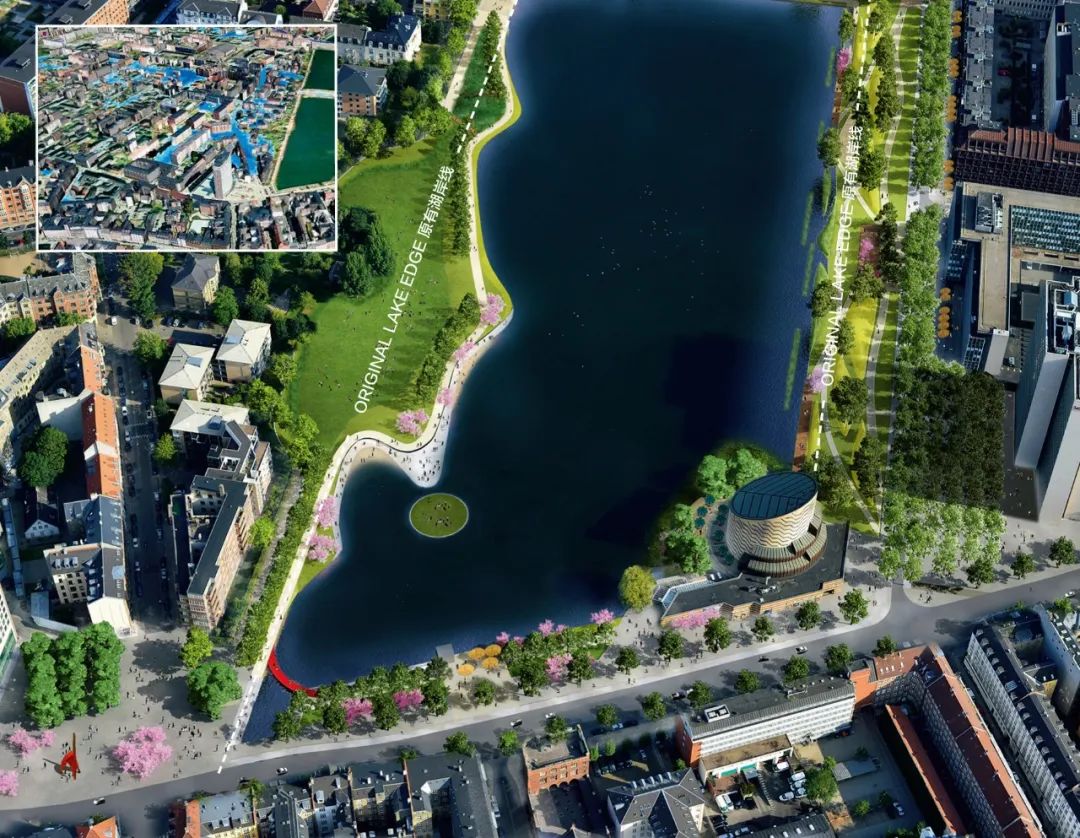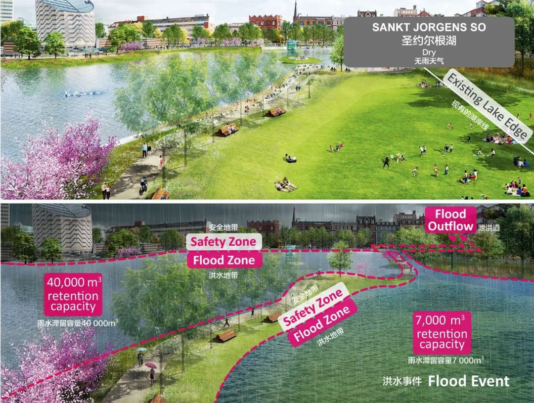 我們的具體策略之一是雨水滯留公園,這是我們的海綿城市“暴雨防控方案”中的一個(gè)關(guān)鍵要素。眾所周知,景色怡人的“藍(lán)綠公園”能夠?yàn)榫用窠】祹?lái)巨大裨益,而經(jīng)過(guò)設(shè)計(jì),這些公園也可以成為吸納特大洪水的“海綿”。該規(guī)劃充分利用哥本哈根市區(qū)三大內(nèi)湖之一的圣約爾根湖,通過(guò)將湖水水位由5.8m降低到2.8m,使其成為一座風(fēng)景秀美的湖濱公園。在提升城市休閑娛樂(lè)價(jià)值的同時(shí),海綿城市設(shè)計(jì)也為城市創(chuàng)造出一大片雨水集蓄區(qū)。而傳統(tǒng)的工程設(shè)計(jì)方式則只能通過(guò)建造巨型的、造價(jià)高昂的泄洪道或管網(wǎng)來(lái)傳輸雨水——而鑒于大型暴雨事件十分罕見,這些設(shè)施在絕大多數(shù)情況下都將處于閑置狀態(tài)。與埋設(shè)地下雨洪排水管的工程造價(jià)相比,建造于地上的圣約爾根湖方案將節(jié)省大約10億元人民幣。通過(guò)這一看似簡(jiǎn)單的景觀設(shè)計(jì)策略,安博實(shí)現(xiàn)了以遠(yuǎn)低于傳統(tǒng)水泥蓄水池的成本來(lái)建造巨型蓄水設(shè)施的目標(biāo)。更為重要的是,人們可以走進(jìn)我們新建的藍(lán)綠公園,享受閑暇與歡愉。