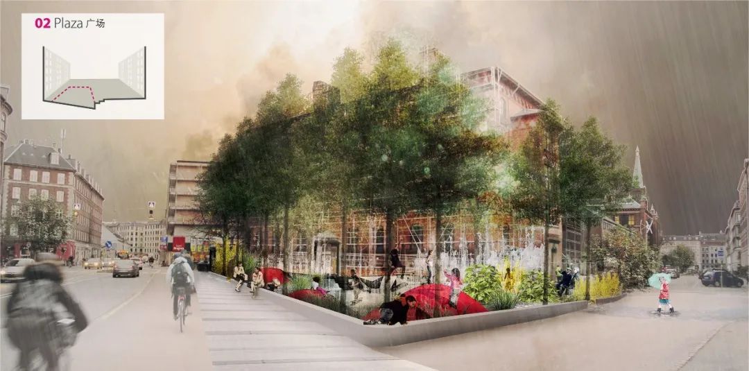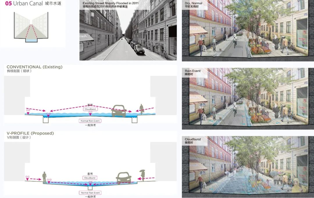 在海綿城市設(shè)計(jì)中,對(duì)城市宜居性的提升應(yīng)與對(duì)氣候的適應(yīng)并重。作為此方面的典范,丹麥?zhǔn)锥几绫竟械谋┯攴揽卦敿?xì)規(guī)劃提出了一套雄心勃勃的計(jì)劃,旨在幫助城市免受未來(lái)的暴雨之害??傮w規(guī)劃確立后,哥本哈根市政府開始著手為城市的各個(gè)分區(qū)制定具體的海綿城市景觀設(shè)計(jì)方案。此次景觀設(shè)計(jì)將不僅能夠應(yīng)對(duì)日益頻繁的極端暴雨天氣,還可以大幅度提升城市的宜居性,造福今時(shí)與后世的居民。此外,整套規(guī)劃的總體耗資也低于傳統(tǒng)工程方案。
