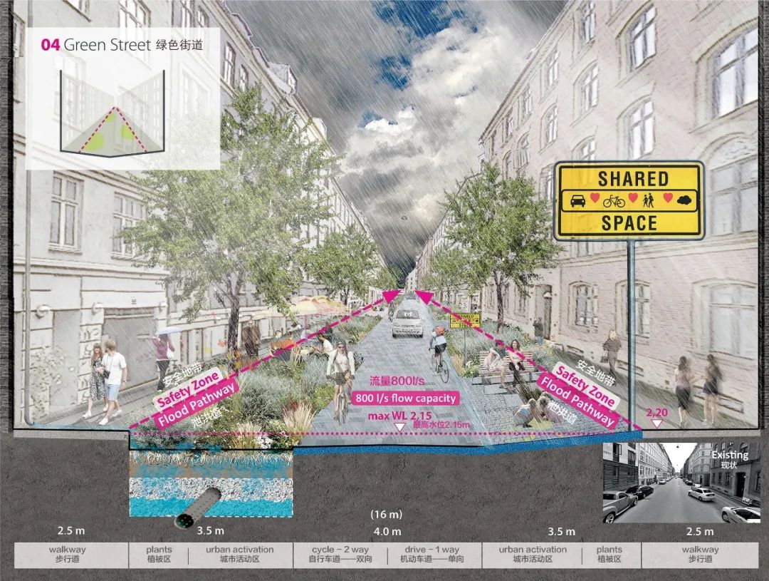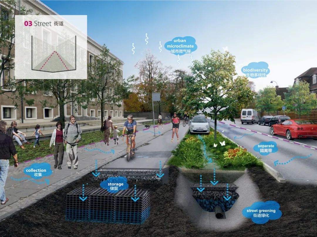 另一個(gè)用來(lái)緩解極端暴雨影響的具體策略是雨水滯留街道。這些街道通常是位于低洼、脆弱區(qū)域上游的次級(jí)道路,通過(guò)街道內(nèi)部的設(shè)計(jì)來(lái)創(chuàng)造巨大的蓄水空間。在不對(duì)交通產(chǎn)生重大妨礙的情況下,這些次級(jí)道路通??杀桓脑斐捎晁疁艚值馈Mㄟ^(guò)增加洼地、透水鋪裝等方式實(shí)現(xiàn)對(duì)雨水的滯留,并可以凈化雨水,從而實(shí)現(xiàn)對(duì)地下含水層的補(bǔ)給。