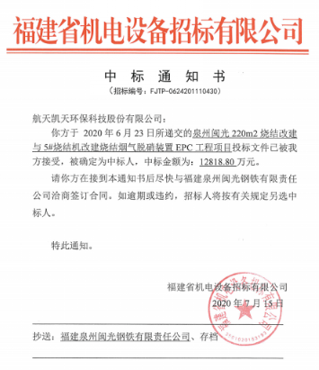 在6月到7月間,連續(xù)中標甘肅通渭縣生活垃圾處理系統(tǒng)設備采購項目、金鼎重工有限公司1#燒結機濕式電除塵器項目、金鼎重工有限公司白灰窯煙氣脫硝項目、福建三鋼閩光股份有限公司動力廠278th鍋爐煙氣增加SCR脫硝裝置及煙道換熱設備改造工程項目、泉州閩光220m²燒結改建與5#燒結機改建燒結煙氣脫硝裝置EPC工程項目、安陽市新普鋼鐵有限公司固定床脫硫脫硝改造SDS+布袋除塵燃煤氣鍋爐爐內SCR脫硝改造環(huán)保升級項目等6個項目,合計中標額1.95548億元,其中泉州閩光220m²燒結改建與5#燒結機改建燒結煙氣脫硝裝置EPC工程,中標金額12818.8萬元,刷新了航天凱天環(huán)保大氣環(huán)境治理業(yè)務單個合同金額,也為企業(yè)在鋼鐵行業(yè)煙氣治理領域再樹典型業(yè)績。