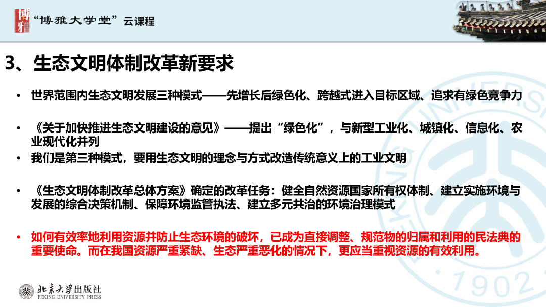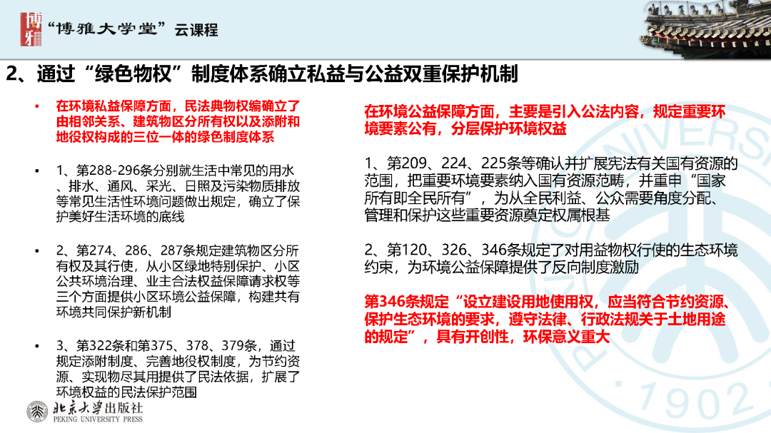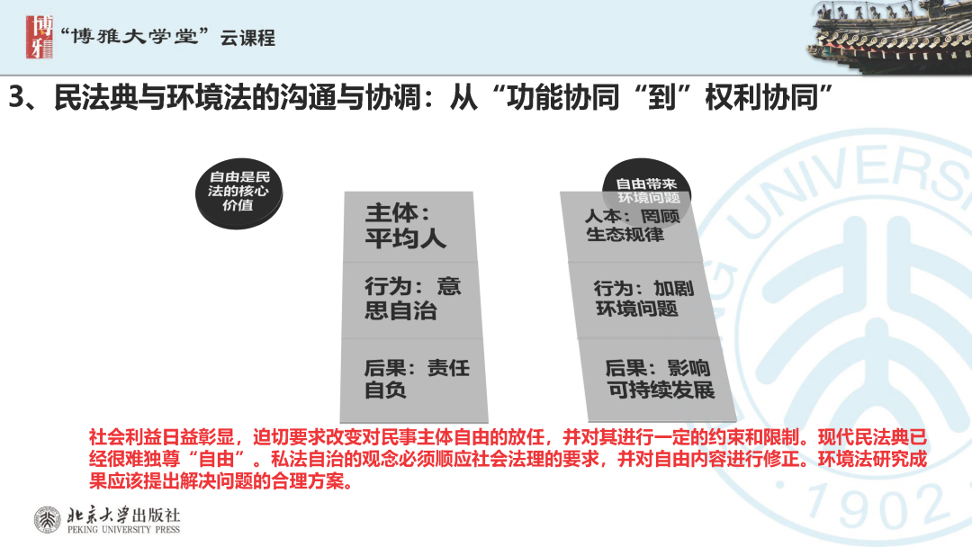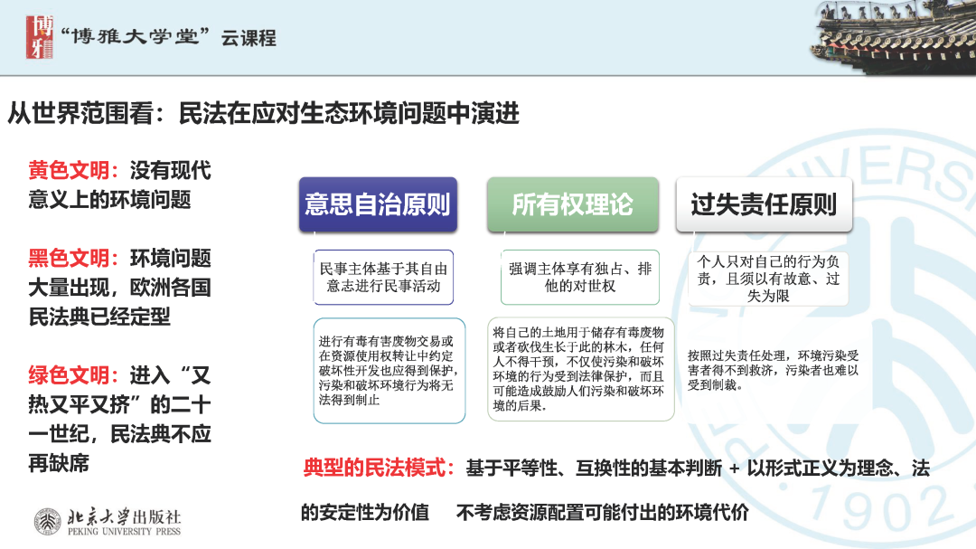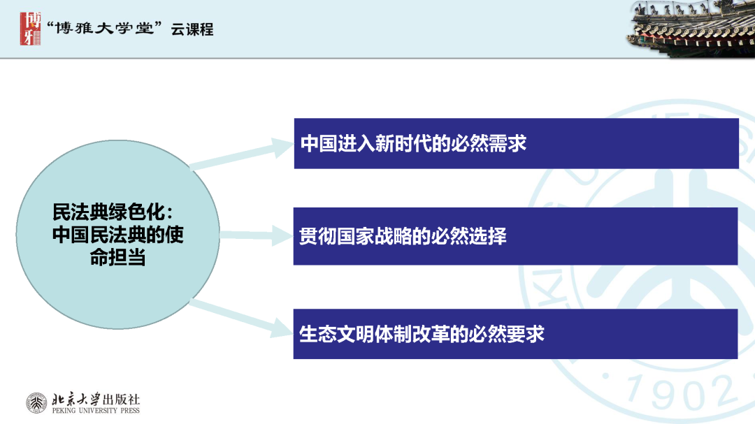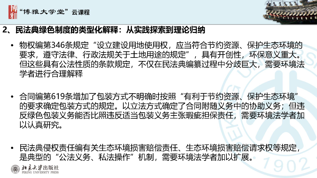 本文為?呂忠梅?老師在博雅大學(xué)堂上的報(bào)告。題目為《綠色民法典實(shí)施:環(huán)境法的機(jī)遇與挑戰(zhàn)》。內(nèi)容主要涉及民法典為什么要綠色化、民法典的綠色規(guī)則體系及綠色民法典給環(huán)境法帶來(lái)的新機(jī)遇和新挑戰(zhàn)。