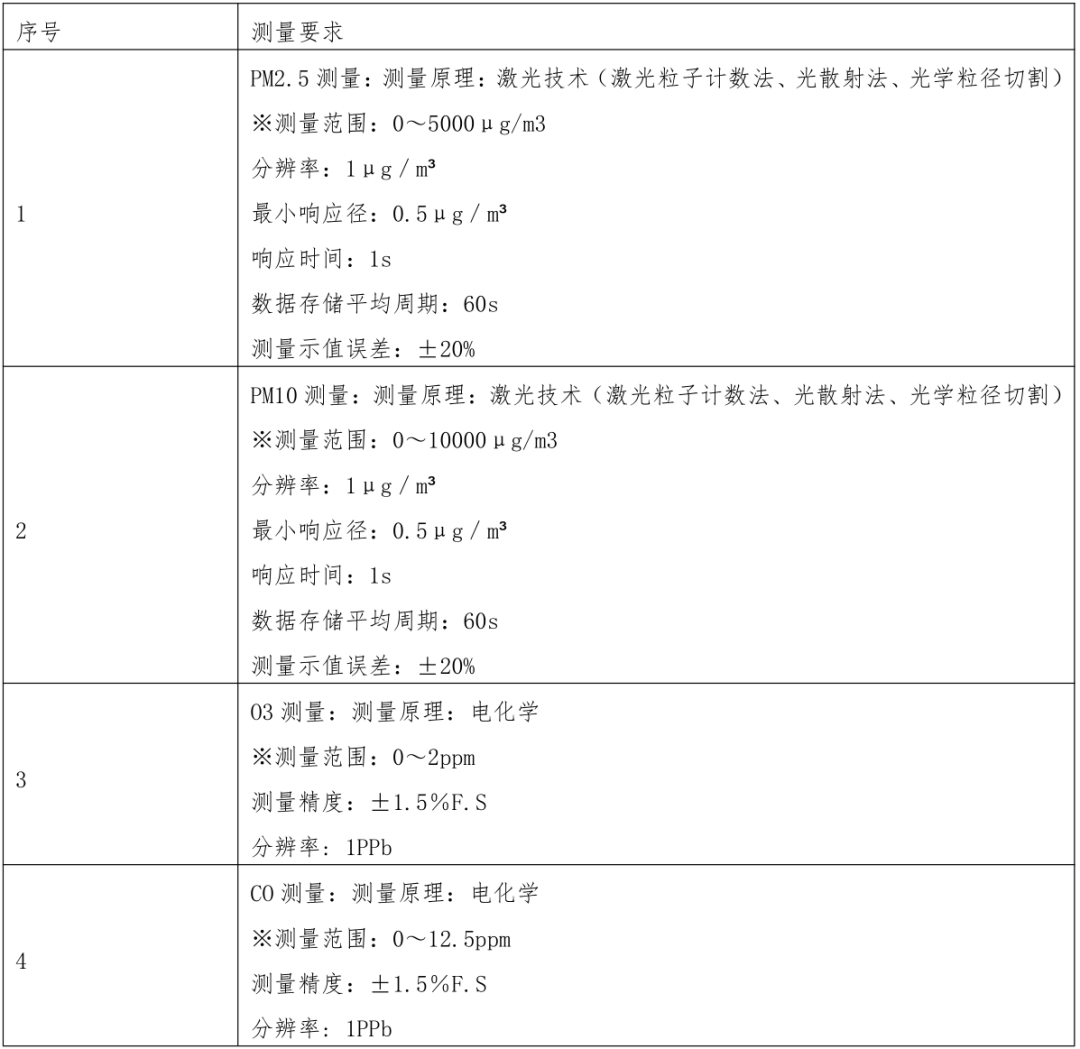 該項(xiàng)目需環(huán)境空氣網(wǎng)格化監(jiān)測(cè)系統(tǒng),集成 PM2.5、PM10、O3、CO、SO2、NO2、TVOC、濕度、溫度、風(fēng)速、風(fēng)向在線監(jiān)測(cè)儀、數(shù)據(jù)采集等技術(shù)為一體的智能監(jiān)測(cè)終端,主要用于環(huán)境空氣質(zhì)量的在線實(shí)時(shí)自動(dòng)監(jiān)控。執(zhí)行標(biāo)準(zhǔn)為生態(tài)環(huán)境部技術(shù)指南、GB3095-2012、GB/T6167、GB/T35273-2017《地面氣象觀測(cè)規(guī)范》。