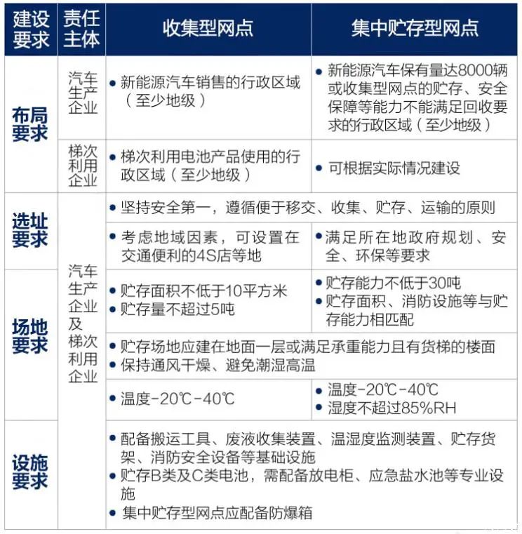 電池回收網(wǎng)點分為收集型網(wǎng)點和集中貯存型網(wǎng)點。這兩類網(wǎng)點分工也不難理解,收集型網(wǎng)點是收集、暫存廢舊動力電池的場地,主要用于存放從車主手中回收到的動力電池;集中貯存型網(wǎng)點,則是大批量儲存報廢車輛或者廢舊動力電池的場地,用于中轉(zhuǎn)、集中儲運回收上來的動力電池。