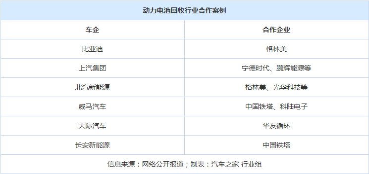 羅蘭貝格管理咨詢公司執(zhí)行總監(jiān)吳釗看來,具備客戶和渠道基礎(chǔ)是解決動力電池回收問題的核心,考慮到電池回收的運營體系復雜性,目前市場上主流做法為“抱團合作”,即車企、電池企業(yè)及回收企業(yè)達成戰(zhàn)略合作,利用各自的優(yōu)勢,解決動力電池回收難題。