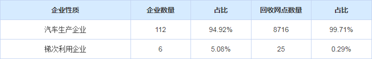 汽車之家統(tǒng)計出工信部公布的動力電池回收網(wǎng)點情況,截至2020年5月,全國共有回收服務(wù)網(wǎng)點8741個,其中涉及整車企業(yè)112家,梯次利用企業(yè)6家。從網(wǎng)點分布情況來看,車企建立的回收網(wǎng)點占據(jù)絕大部分數(shù)量,在全國各地均有覆蓋。從具體網(wǎng)點來看,以汽車企業(yè)4S店網(wǎng)絡(luò)為主,也有少部分與車企合作的報廢拆解企業(yè)建立的網(wǎng)點,以及梯次利用企業(yè)建立的網(wǎng)點。