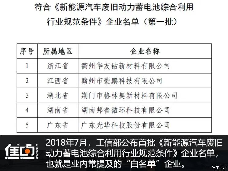 2018年7月底,工信部就公布首批符合《新能源汽車廢舊動力蓄電池綜合利用行業(yè)規(guī)范條件》(簡稱《規(guī)范條件》)企業(yè)名單。2020年1月,工信部發(fā)布《規(guī)范條件(2019年本)》,對動力電池回收企業(yè)申報條件提出更多的要求。未來,會有更多符合電池回收條件的“白名單”企業(yè)。