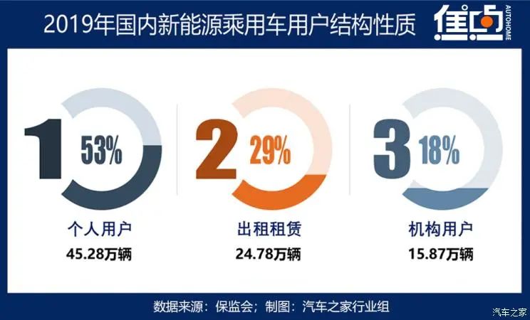 再看新能源乘用車都賣給了誰?以2019年數(shù)據(jù)為例,汽車之家了解到,個體用戶、出租租賃、機構(gòu)用戶是新能源乘用車采購的三大“金主”。