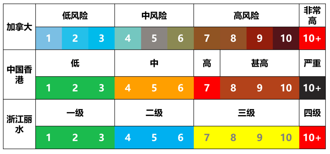 加拿大、中國(guó)香港和浙江麗水的AQHI分級(jí)
