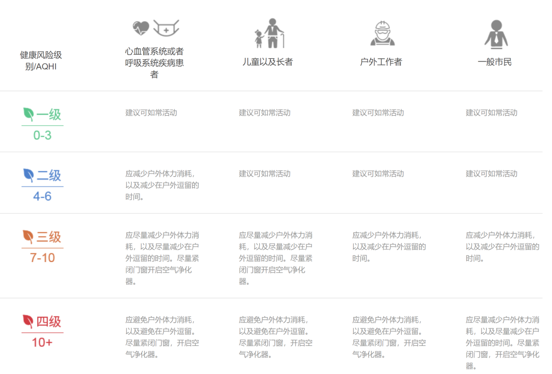它們的級(jí)別劃分略有不同,各級(jí)別有針對(duì)不同類別人群的相應(yīng)健康指引。