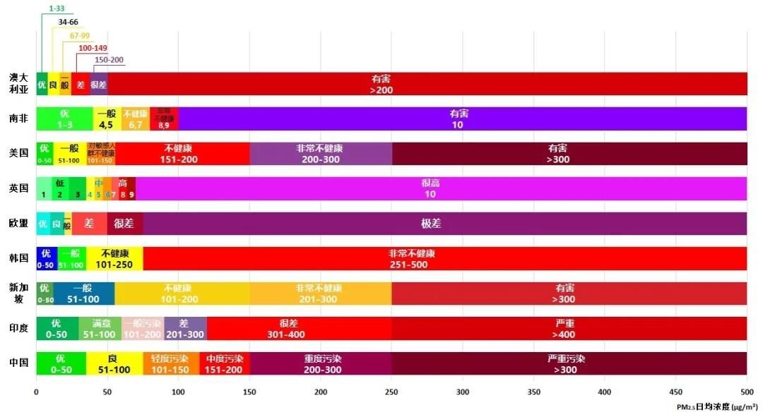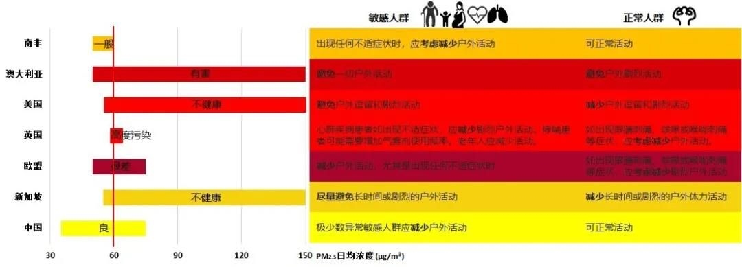 在相同的PM2.5日均濃度下,各國(guó)對(duì)應(yīng)的空氣質(zhì)量級(jí)別是完全不同的,這就決定了相應(yīng)的健康指引也存在差異。