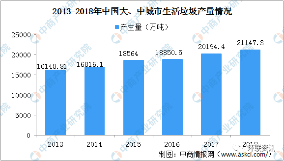 我國(guó)是人口大國(guó),也是垃圾產(chǎn)生大國(guó),且隨著經(jīng)濟(jì)穩(wěn)步發(fā)展、民眾生活消費(fèi)水平、城鎮(zhèn)化率不斷提高,生活垃圾產(chǎn)生量持續(xù)走高,2018年,全國(guó)200個(gè)大、中城市生活垃圾產(chǎn)生量21147.3萬(wàn)噸。