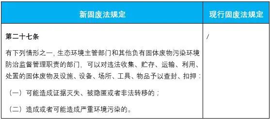 4.明確了對違法收集、貯存、運輸、利用、處置的固體廢物及設施、設備、場所、工具、物品予以查封、扣押的規(guī)定