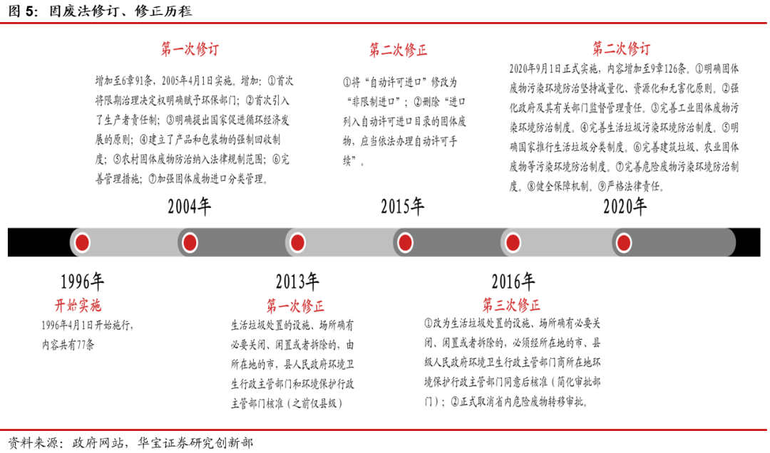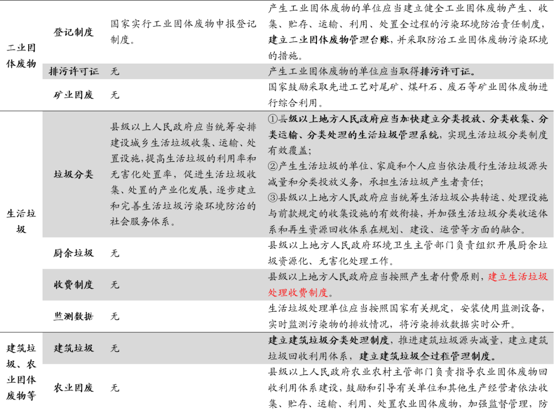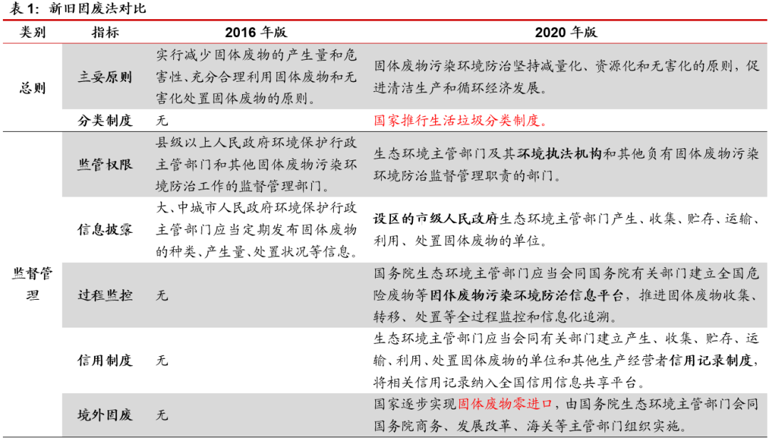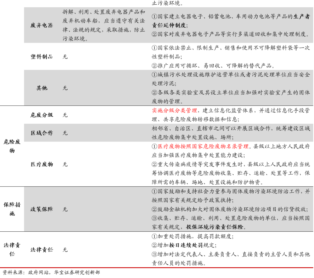 從具體內(nèi)容上來看,相較于2016年修正版,新固廢法新增垃圾分類、污泥、建筑垃圾、醫(yī)療廢物、塑料制品等相關(guān)內(nèi)容。垃圾分類方面:推行生活垃圾分類制度,建立差別化生活垃圾處理收費(fèi)制度。將垃圾分類寫入新固廢法中,明確責(zé)任主體和收費(fèi)制度,解決政策端和費(fèi)用端兩大限制問題,為垃圾分類的順利開展提供保障。具體來看,1)新固廢法提出國家推行生活垃圾分類制度,要求縣級以上地方人民政府應(yīng)當(dāng)加快建立分類投放、分類收集、分類運(yùn)輸、分類處理的生活垃圾管理系統(tǒng),實(shí)現(xiàn)生活垃圾分類制度有效覆蓋;2)縣級以上地方人民政府應(yīng)當(dāng)按照產(chǎn)生者付費(fèi)原則,建立生活垃圾處理收費(fèi)制度,縣級以上地方人民政府制定生活垃圾處理收費(fèi)標(biāo)準(zhǔn),應(yīng)當(dāng)根據(jù)本地實(shí)際,結(jié)合生活垃圾分類情況,體現(xiàn)分類計價、計量收費(fèi)等差別化管理。污泥處理方面:關(guān)注污泥處理,促進(jìn)污水污泥處理系統(tǒng)協(xié)同發(fā)展。污水處理過程中常有“重水輕泥”等問題,污泥處理技術(shù)較弱,新固廢法將污泥處理管理列入監(jiān)管范圍,明確污泥處理標(biāo)準(zhǔn),從而促進(jìn)污泥穩(wěn)定化、減量化和無害化處理。具體來看,1)城鎮(zhèn)污水處理設(shè)施維護(hù)運(yùn)營單位或者污泥處理單位應(yīng)當(dāng)安全處理污泥,保證處理后的污泥符合國家有關(guān)標(biāo)準(zhǔn),對污泥的流向、用途、用量等進(jìn)行跟蹤、記錄,并報告城鎮(zhèn)排水主管部門、生態(tài)環(huán)境主管部門??h級以上人民政府城鎮(zhèn)排水主管部門應(yīng)當(dāng)將污泥處理設(shè)施納入城鎮(zhèn)排水與污水處理規(guī)劃,推動同步建設(shè)污泥處理設(shè)施與污水處理設(shè)施,鼓勵協(xié)同處理,污水處理費(fèi)征收標(biāo)準(zhǔn)和補(bǔ)償范圍應(yīng)當(dāng)覆蓋污泥處理成本和污水處理設(shè)施正常運(yùn)營成本。2)禁止擅自傾倒、堆放、丟棄、遺撒城鎮(zhèn)污水處理設(shè)施產(chǎn)生的污泥和處理后的污泥。建筑垃圾方面:建立建筑垃圾分類處理和全過程管理制度。新固廢法將建筑垃圾單獨(dú)提出,有利于其實(shí)現(xiàn)獨(dú)立管理,促進(jìn)我國促進(jìn)我國建筑垃圾分類處理、回收利用、全過程管理的制度和體系的建立。具體來看,1)縣級以上地方人民政府應(yīng)當(dāng)加強(qiáng)建筑垃圾污染環(huán)境的防治,建立建筑垃圾分類處理制度;2)縣級以上地方人民政府環(huán)境衛(wèi)生主管部門負(fù)責(zé)建筑垃圾污染環(huán)境防治工作,建立建筑垃圾全過程管理制度,規(guī)范建筑垃圾產(chǎn)生、收集、貯存、運(yùn)輸、利用、處置行為,推進(jìn)綜合利用,加強(qiáng)建筑垃圾處置設(shè)施、場所建設(shè),保障處置安全,防止污染環(huán)境。醫(yī)療廢物方面:新增醫(yī)療廢物管理機(jī)制,加強(qiáng)醫(yī)廢集中處置能力。疫情引發(fā)公眾對于醫(yī)療廢物處理處置的關(guān)注,也暴露出醫(yī)廢處理處置能力上的缺口,新固廢法新增醫(yī)療廢物管理的相關(guān)規(guī)定,從法律層面補(bǔ)足短板,促進(jìn)未來管理的規(guī)范化和處置能力的進(jìn)一步提升。具體來看,1)明確醫(yī)療廢物按照國家危險廢物名錄管理:“縣級以上地方人民政府應(yīng)當(dāng)加強(qiáng)醫(yī)療廢物集中處置能力建設(shè)”;2)明確監(jiān)管職責(zé):“縣級以上人民政府衛(wèi)生健康、生態(tài)環(huán)境等主管部門應(yīng)當(dāng)在各自職責(zé)范圍內(nèi)加強(qiáng)對醫(yī)療廢物收集、貯存、運(yùn)輸、處置的監(jiān)督管理,防止危害公眾健康、污染環(huán)境”;3)突出主體責(zé)任:“醫(yī)療衛(wèi)生機(jī)構(gòu)應(yīng)當(dāng)依法分類收集本單位產(chǎn)生的醫(yī)療廢物,交由醫(yī)療廢物集中處置單位處置。醫(yī)療廢物集中處置單位應(yīng)當(dāng)及時收集、運(yùn)輸和處置醫(yī)療廢物;醫(yī)療衛(wèi)生機(jī)構(gòu)和醫(yī)療廢物集中處置單位,應(yīng)當(dāng)采取有效措施,防止醫(yī)療廢物流失、泄漏、滲漏、擴(kuò)散。”;4)完善應(yīng)急保障機(jī)制:“重大傳染病疫情等突發(fā)事件發(fā)生時,縣級以上人民政府應(yīng)當(dāng)統(tǒng)籌協(xié)調(diào)醫(yī)療廢物等危險廢物收集、貯存、運(yùn)輸、處置等工作,保障所需的車輛、場地、處置設(shè)施和防護(hù)物資?!?。危險廢物方面:實(shí)施危廢分級分類管理,鼓勵區(qū)域合作集中處置。新固廢法首次提出危廢實(shí)施分級分類管理,對于部分危廢的部分環(huán)節(jié)實(shí)行豁免管理,為危廢分級提供法律依據(jù),在規(guī)范化管理的前提下進(jìn)一步提升危廢處理處置效率,此外,區(qū)域合作處置措施的推進(jìn)也將進(jìn)一步解決危廢處置產(chǎn)能錯配等結(jié)構(gòu)性問題。具體來看,1)新增分級管理:“國務(wù)院生態(tài)環(huán)境主管部門根據(jù)危險廢物的危害特性和產(chǎn)生數(shù)量,科學(xué)評估其環(huán)境風(fēng)險,實(shí)施分級分類管理,建立信息化監(jiān)管體系,并通過信息化手段管理、共享危險廢物轉(zhuǎn)移數(shù)據(jù)和信息”;2)鼓勵區(qū)域合作:“相鄰省、自治區(qū)、直轄市之間可以開展區(qū)域合作,統(tǒng)
