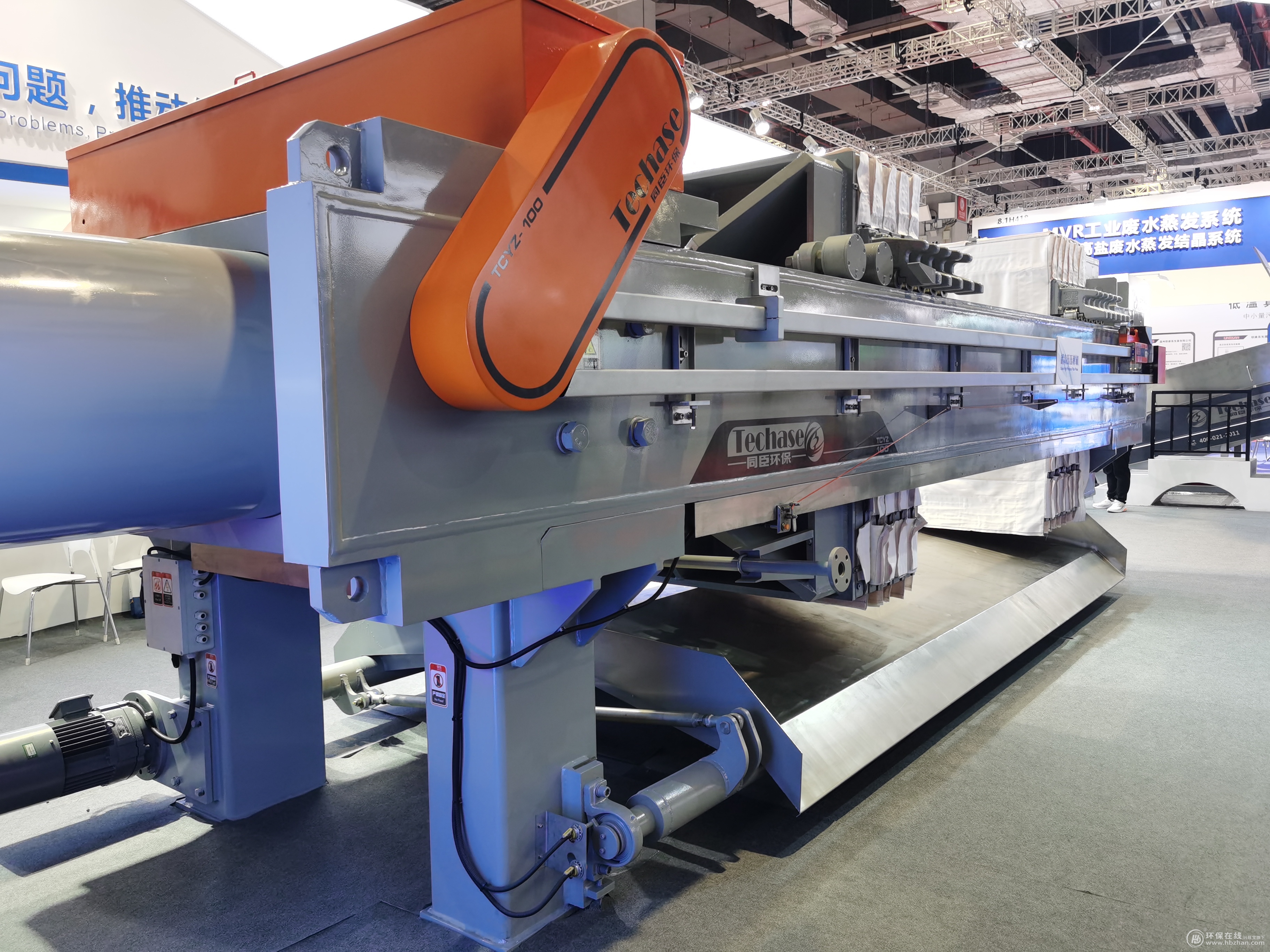 另一款值得注意的產(chǎn)品是超高壓彈性壓榨機。程經(jīng)理指出,這一產(chǎn)品是同臣環(huán)保聯(lián)合同濟大學(xué)環(huán)境學(xué)院和機械學(xué)院,在傳統(tǒng)隔膜壓濾機上進行改進,相比傳統(tǒng)壓榨設(shè)備,同臣超高壓壓榨機壓力更大,效率更高。