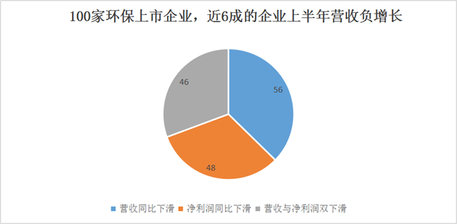 總體來(lái)看,今年上半年,100家環(huán)保上市企業(yè),受大環(huán)境的影響,經(jīng)營(yíng)形勢(shì)大多不太樂(lè)觀。相較于去年同期,有56家企業(yè)營(yíng)業(yè)收入減少,48家企業(yè)凈利潤(rùn)同比下滑,而營(yíng)收和凈利潤(rùn)雙雙下滑的也有46家,約占總數(shù)的一半。(如圖一所示)