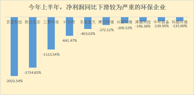 虧損幅度較為嚴(yán)重的當(dāng)屬京藍(lán)科技、鐵漢生態(tài)和三聚環(huán)保,凈利潤(rùn)分別較去年同期下降了-2023.54%、-1734.65%和-1113.54%,經(jīng)營(yíng)狀況惡化。