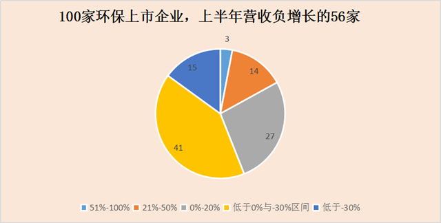 營(yíng)收變動(dòng)幅度方面,數(shù)據(jù)不那么喜人。100家環(huán)保上市企業(yè),上半年?duì)I收同比下滑,負(fù)增長(zhǎng)有56家,接近6成。也就是說(shuō),一半以上的企業(yè)主營(yíng)業(yè)務(wù)收入都不及往年。(如圖四)