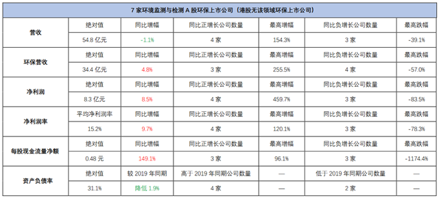 環(huán)境監(jiān)測與檢測領(lǐng)域(7家):營收規(guī)模收縮,環(huán)保營收規(guī)模和獲利能力雙增長,現(xiàn)金流情況改善明顯,負(fù)債水平小幅下降。