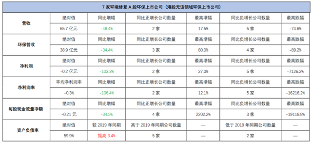 環(huán)境修復(fù)領(lǐng)域(7家):營收和環(huán)保營收規(guī)模均收縮,獲利能力大幅下滑,現(xiàn)金流情況不及上年同期,負(fù)債水平上升。