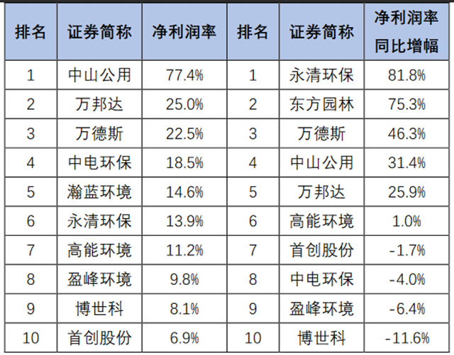 2020年上半年163家(A股+港股)環(huán)保上市公司凈利潤率TOP20