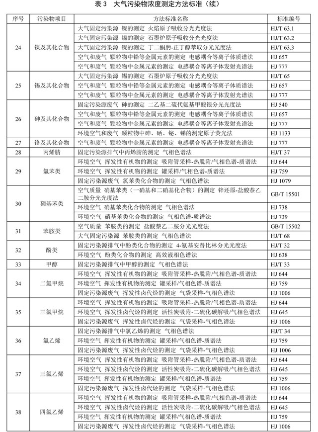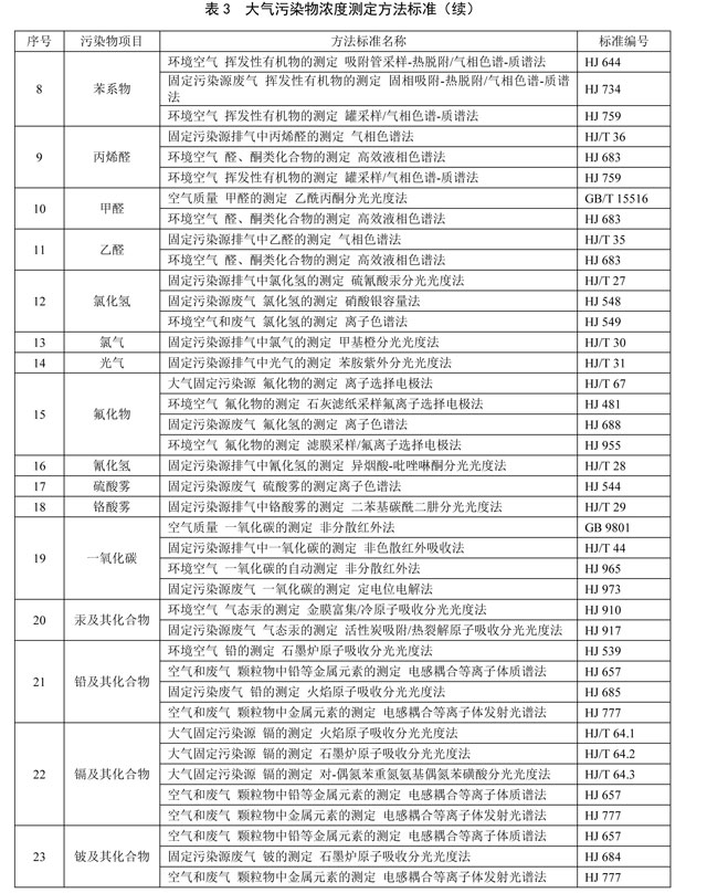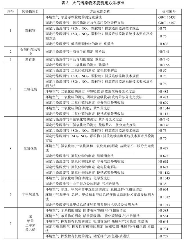 5.6 對(duì)大氣污染物排放濃度的測定采用表3所列的方法標(biāo)準(zhǔn)。本標(biāo)準(zhǔn)發(fā)布實(shí)施后,有新發(fā)布的國家環(huán)境監(jiān)測分析方法標(biāo)準(zhǔn),其方法適用范圍相同的,也適用于本標(biāo)準(zhǔn)對(duì)應(yīng)污染物的測定。