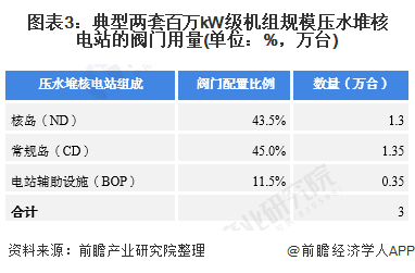 從中國核電機組的發(fā)展來看,核電閥門的需求量遠高于同容量級的火電站。以容量為80萬千瓦的核電站為例,通徑DN25-1000mm的閥門需求量為8000-10000臺,為同類火電站的2-3倍。一座有2套百萬kW級核電機組的核電站需各類閥門3萬臺,其中核島(NI)用閥門1.3萬臺,常規(guī)島(CI)用閥門1.35萬臺,電站輔助設施(BOP)用閥門0.35萬臺。