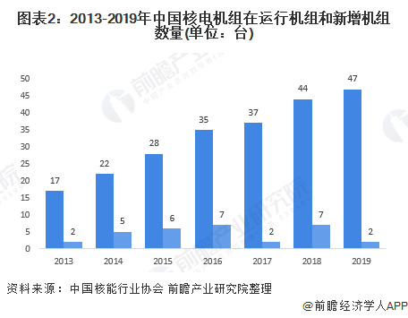 截至2019年,中國運行核電機組共47臺(不含臺灣地區(qū)),裝機容量為48751.16MWe(額定裝機容量),2019年1-12月全國共有2臺核電機組完成首次裝料和并網(wǎng)運行。