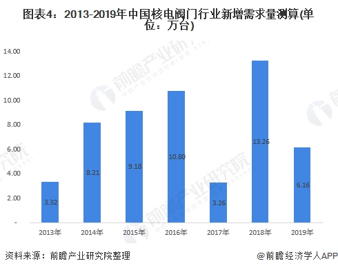 前瞻依照上述邏輯測算,2013年中國核電閥門需求量為3.32萬臺,其中2018年為近年最高,達到13.26萬臺。通過數(shù)據(jù)發(fā)現(xiàn),核電閥門需求量與中國核電投資額的變化基本一致,這也說明核電閥門新增需求行業(yè)發(fā)展嚴重依賴上游核電公司。