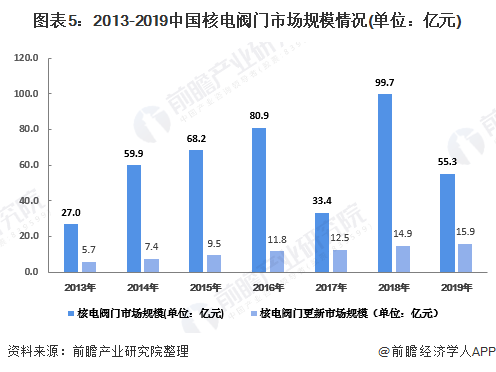 而原有舊核電站的維修保養(yǎng)需求則是與已經(jīng)投入運行中的核電站數(shù)量息息相關,市場規(guī)模相對比較穩(wěn)定。2019年,中國核電閥門市場規(guī)模為55.3億元,其中核電閥門更新市場規(guī)模為15.9億元。