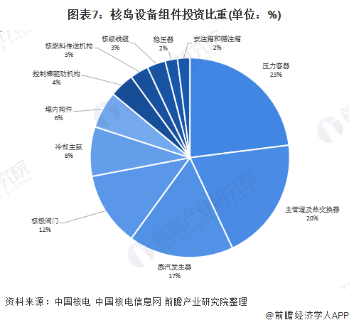 據(jù)中國核電和中國核電信息網(wǎng)的披露,一般而言,核島設備中,壓力容器、主管道及熱交換器、蒸汽發(fā)生器都是投資的重點,其中壓力容器占比為23%,主管道及熱交換器占比為20%,蒸汽發(fā)生器占比為17%,核電閥門占比大概為12%。