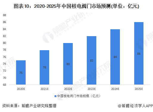 根據(jù)中國政府發(fā)布的十三五計劃和《中國能源中長期(2030-2050)發(fā)展戰(zhàn)略研究》,中國政府規(guī)劃以每年6-8座的速度新建核電站,并為引進自主開發(fā)的新型核電站將投入共5000億元資金。依照過去十幾年中國核電建設速度來看,6-8座核電站(12-16個機組)顯然是不太現(xiàn)實,前瞻假設以每年新建3座核電站計算,每座核電站裝配兩個機組(共6個機組),且每年3座核電站(6個機組)都在當年年底之前投入運營。通過對新增裝機部分需求和已運營電機部分進行計算,前瞻預測2025年中國核電閥門市場將會達到86億元。