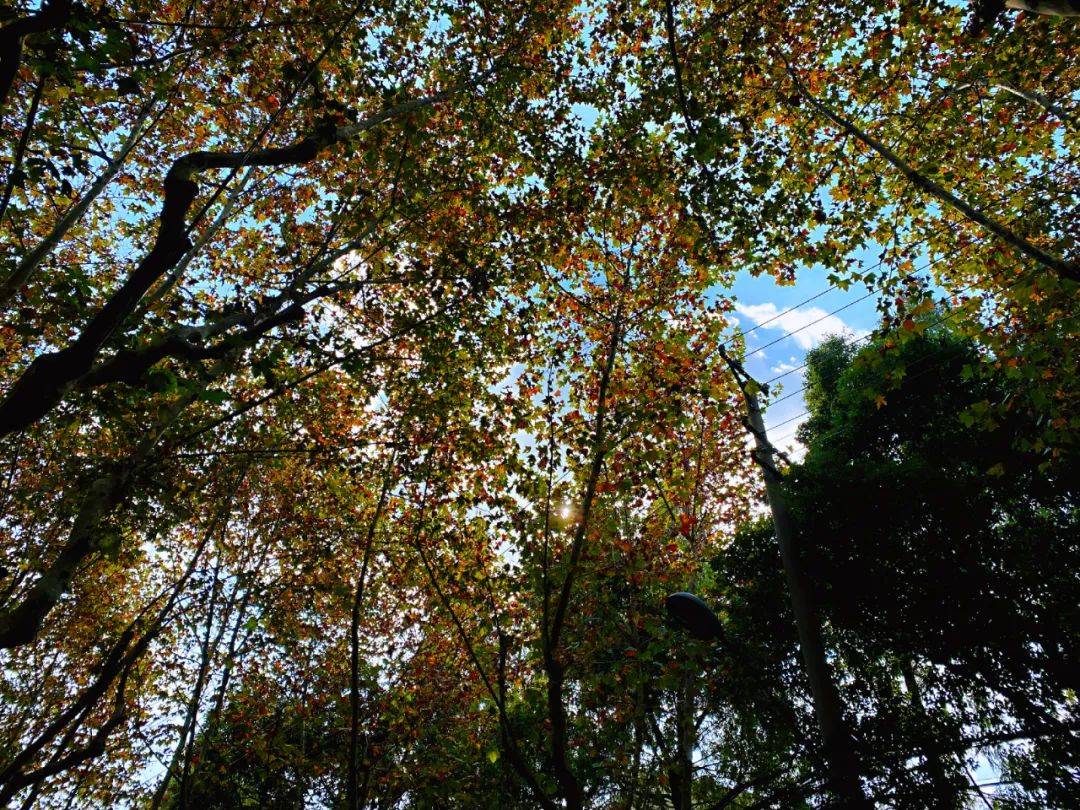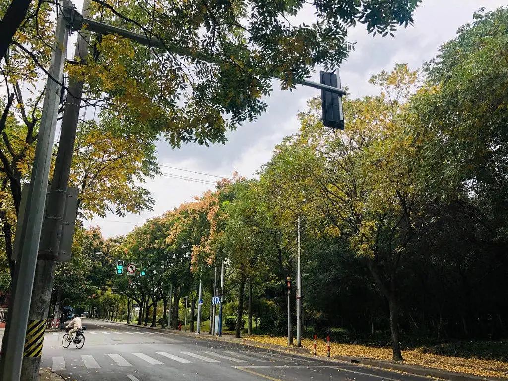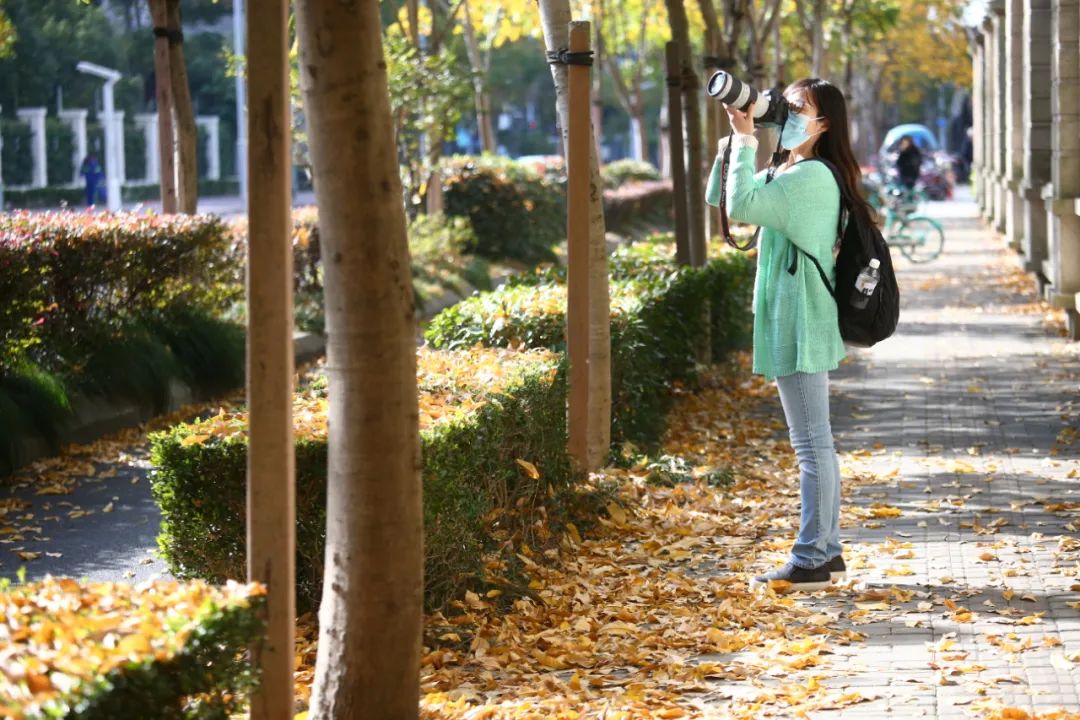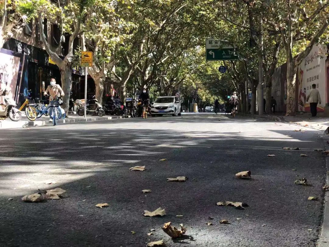 這條長約1公里的道路兩旁種滿了無患子樹,葉片已經(jīng)由綠轉(zhuǎn)黃,只要有風(fēng)“經(jīng)過”,就能看到落葉轉(zhuǎn)著圈旋轉(zhuǎn)著掉落下來,金黃的葉片成為了上海街頭最美的裝飾。
