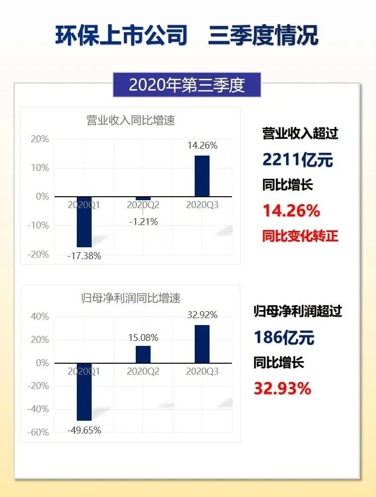 近期,環(huán)保上市公司相繼發(fā)布三季度報(bào)告。從發(fā)布數(shù)據(jù)來看,得益于環(huán)保產(chǎn)業(yè)政策的持續(xù)發(fā)力和我國整體經(jīng)濟(jì)的穩(wěn)步回升,環(huán)保上市公司三季度經(jīng)營狀況整體有所好轉(zhuǎn)。計(jì)入統(tǒng)計(jì)的135家環(huán)保上市公司第三季度營收總額超過2211億元,同比增長14.26%,增速同比變化由負(fù)轉(zhuǎn)正;第三季度歸母凈利潤超過186億元,同比增長32.93%,增速較前兩季度相比大幅提高。