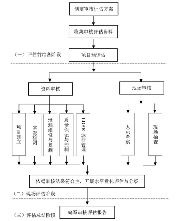 對企業(yè)揮發(fā)性有機(jī)物泄漏檢測與修復(fù)(LDAR)項(xiàng)目進(jìn)行審核評估的方法流程,審核評估形式及要素,審核評估過程,水平量化評分標(biāo)準(zhǔn),現(xiàn)場抽查方法與規(guī)則,審核評估報(bào)告大綱等內(nèi)容及要求。