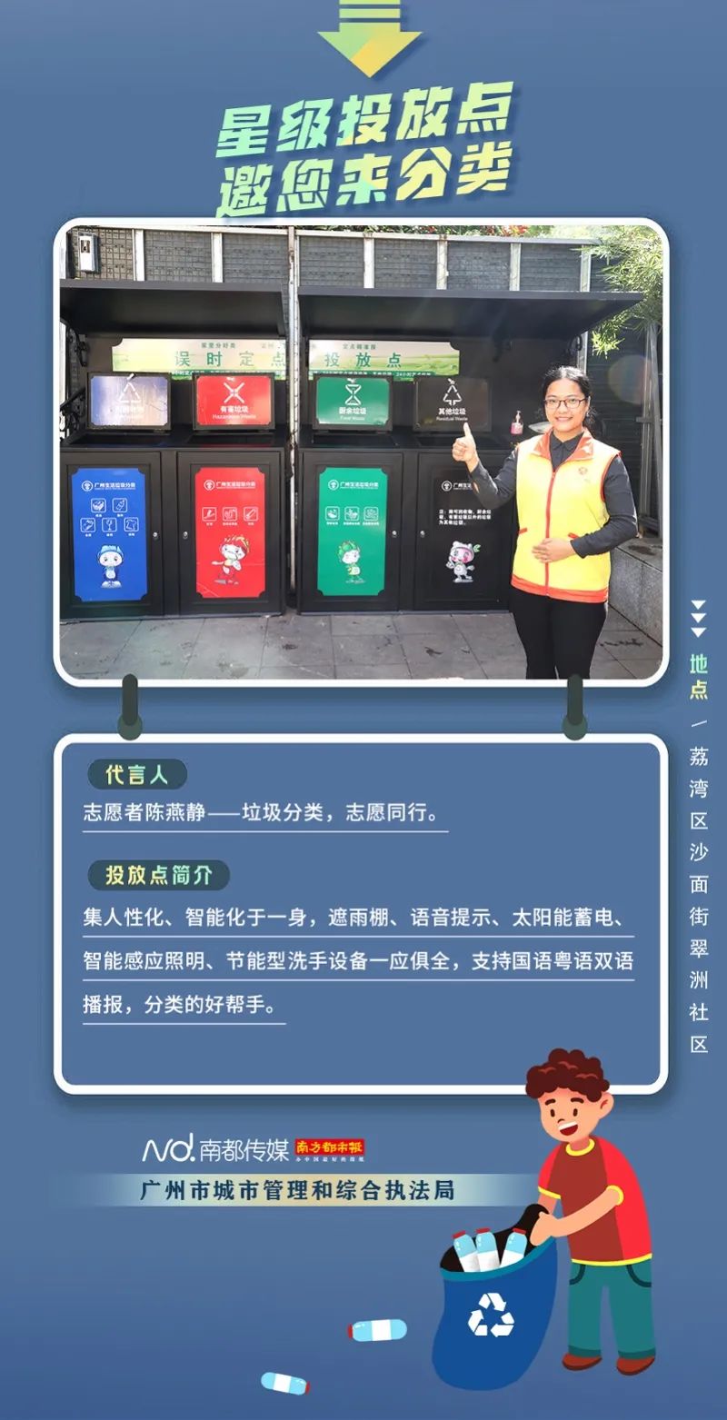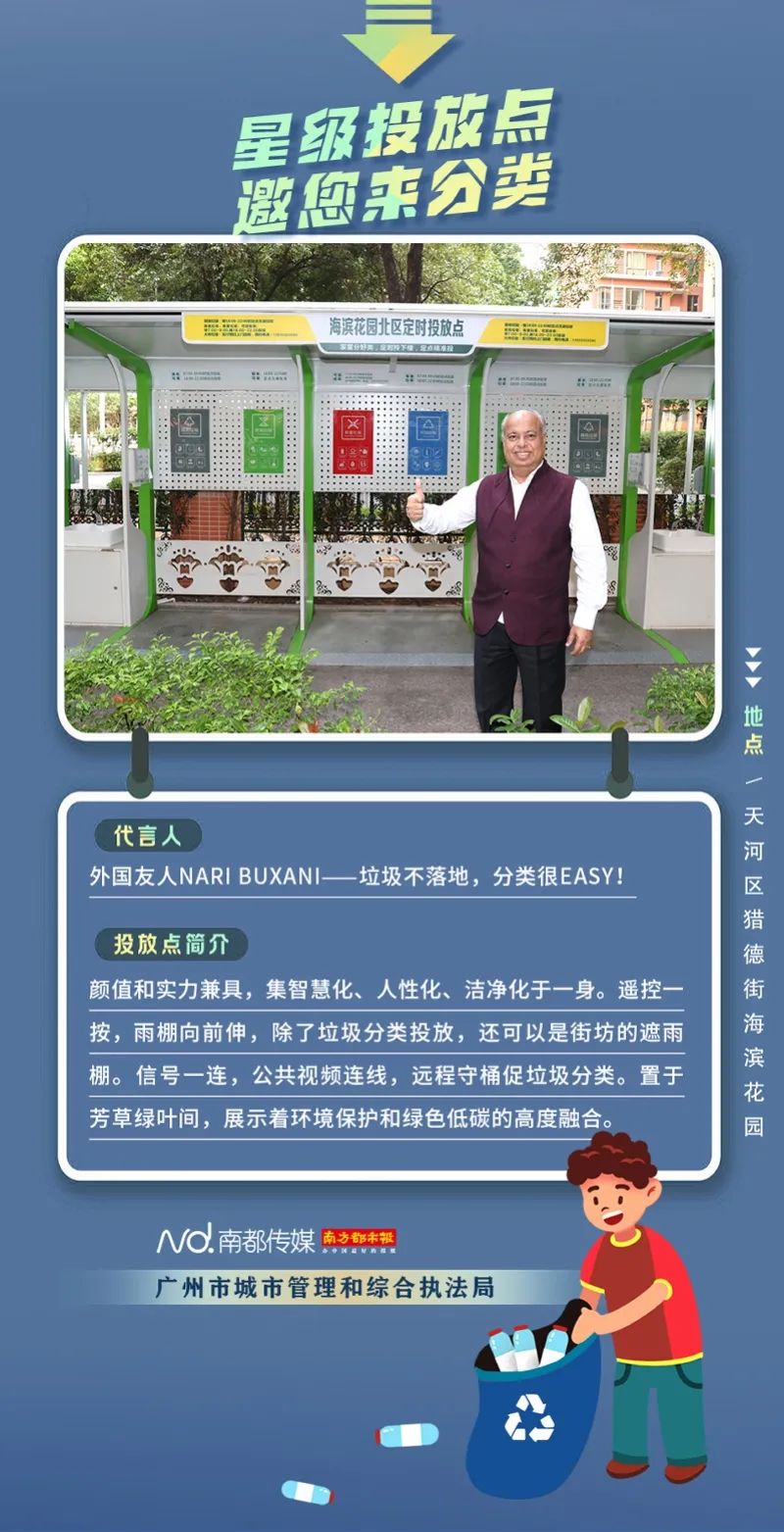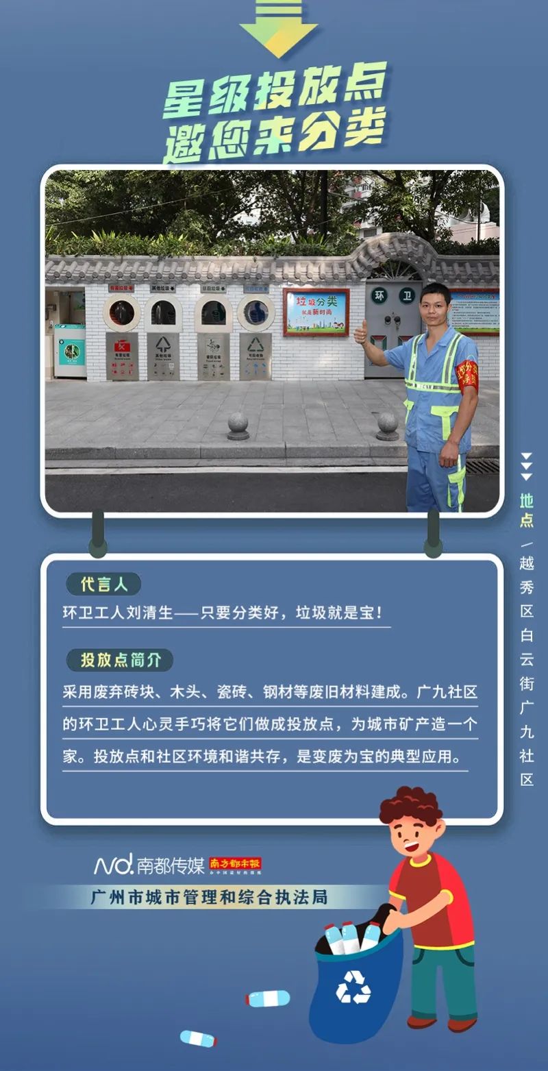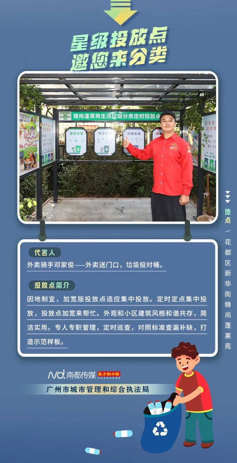 廣州市城市管理和綜合執(zhí)法局聯(lián)合南方都市報聯(lián)合推出“星級投放點 邀您來分類”系列海報,從廣州全市11個行政區(qū)遴選出“星級投放點”,并邀請來自各行各業(yè)的11位廣州街坊為廣州垃圾分類代言。