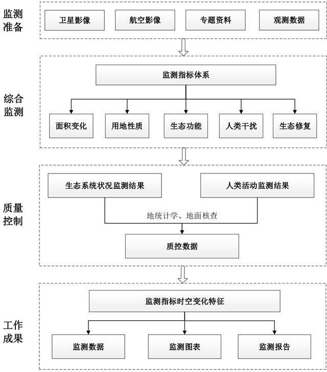 采用衛(wèi)星遙感、近地面航空遙感(無人機(jī))、地面監(jiān)測(cè)相結(jié)合,以衛(wèi)星遙感監(jiān)測(cè)為主的技術(shù)方法,即先利用高時(shí)空衛(wèi)星遙感開展監(jiān)測(cè)因子普查,然后利用無人機(jī)對(duì)典型地區(qū)進(jìn)行抽查,再到野外現(xiàn)場(chǎng)開展關(guān)鍵生態(tài)因子監(jiān)測(cè)和存疑斑塊核查。