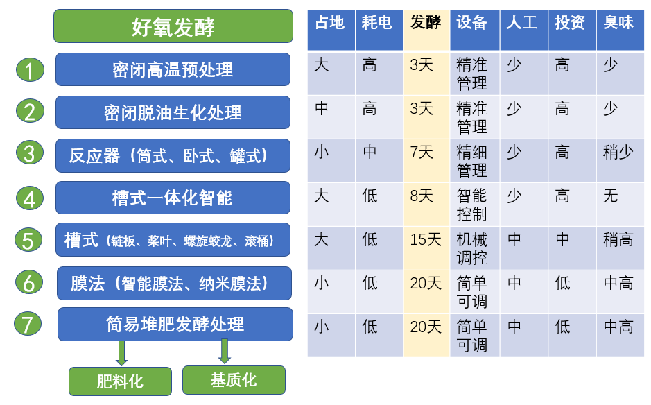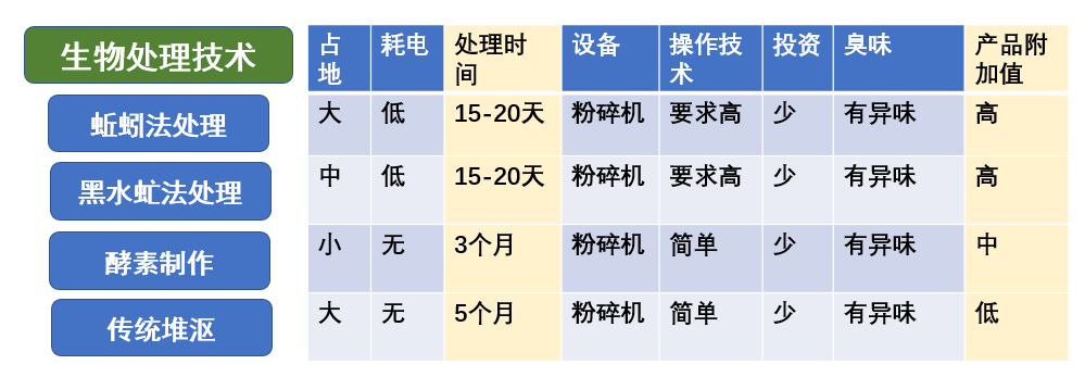 各種生物法處理技術(shù)有其不同的特點(diǎn),通過比較處理廢棄物占地多少、處理噸成本耗電、發(fā)酵時(shí)間長短、處理操作難易與投資高低、人工投入多少、處理過程對(duì)環(huán)境產(chǎn)生的臭味異味多少、產(chǎn)品附加值高低,來了解不同處理技術(shù)的優(yōu)點(diǎn)和不足。