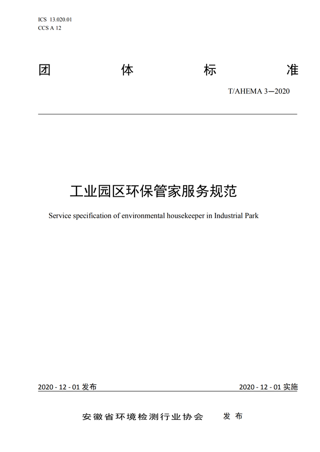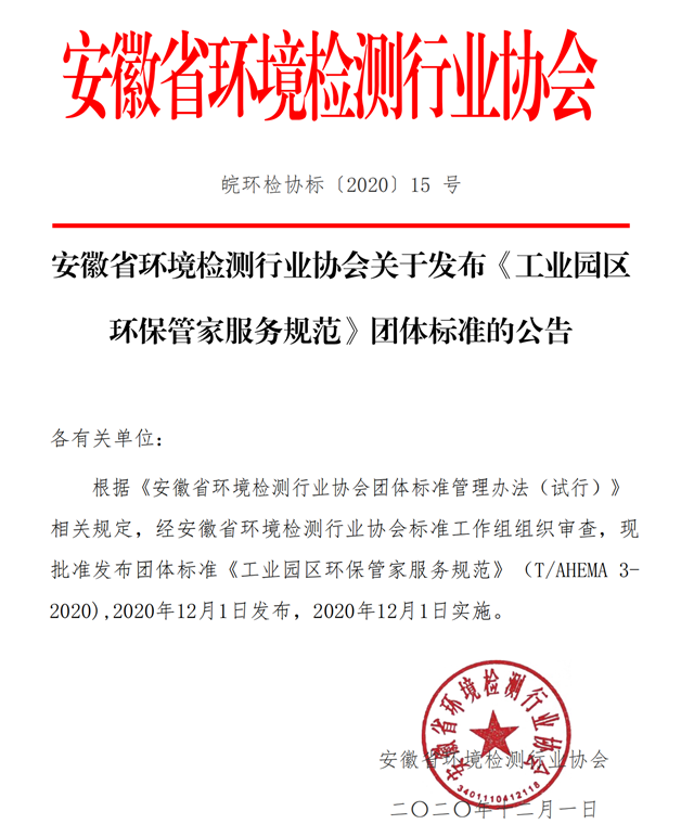 根據(jù)《安徽省環(huán)境檢測行業(yè)協(xié)會(huì)團(tuán)體標(biāo)準(zhǔn)管理辦法(試行)》 相關(guān)規(guī)定,經(jīng)安徽省環(huán)境檢測行業(yè)協(xié)會(huì)標(biāo)準(zhǔn)工作組組織審查,現(xiàn)批準(zhǔn)發(fā)布團(tuán)體標(biāo)準(zhǔn)《工業(yè)園區(qū)環(huán)保管家服務(wù)規(guī)范》(T/AHEMA 3-2020),2020年12月1日發(fā)布,2020年12月1日實(shí)施。