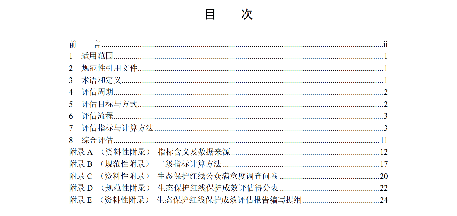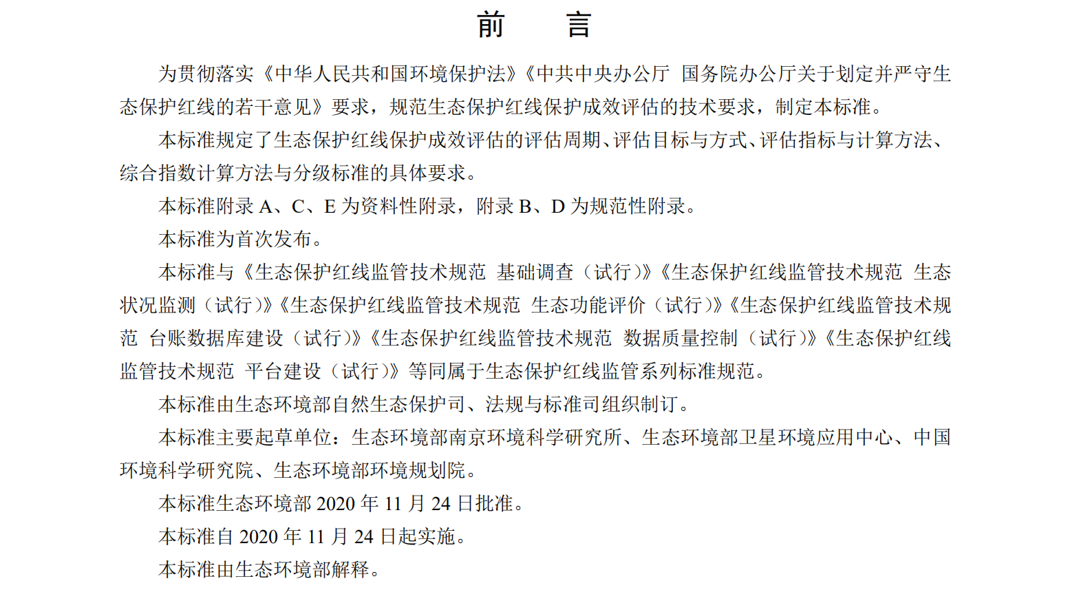為貫徹落實(shí)《中華人民共和國(guó)環(huán)境保護(hù)法》《中共中央辦公廳 國(guó)務(wù)院辦公廳關(guān)于劃定并嚴(yán)守生態(tài)保護(hù)紅線的若干意見(jiàn)》要求,規(guī)范生態(tài)保護(hù)紅線保護(hù)成效評(píng)估的技術(shù)要求,制定本標(biāo)準(zhǔn)。本標(biāo)準(zhǔn)規(guī)定了生態(tài)保護(hù)紅線保護(hù)成效評(píng)估的評(píng)估周期、評(píng)估目標(biāo)與方式、評(píng)估指標(biāo)與計(jì)算方法、綜合指數(shù)計(jì)算方法與分級(jí)標(biāo)準(zhǔn)的具體要求。本標(biāo)準(zhǔn)附錄 A、C、E 為資料性附錄,附錄 B、D 為規(guī)范性附錄。本標(biāo)準(zhǔn)為首次發(fā)布。