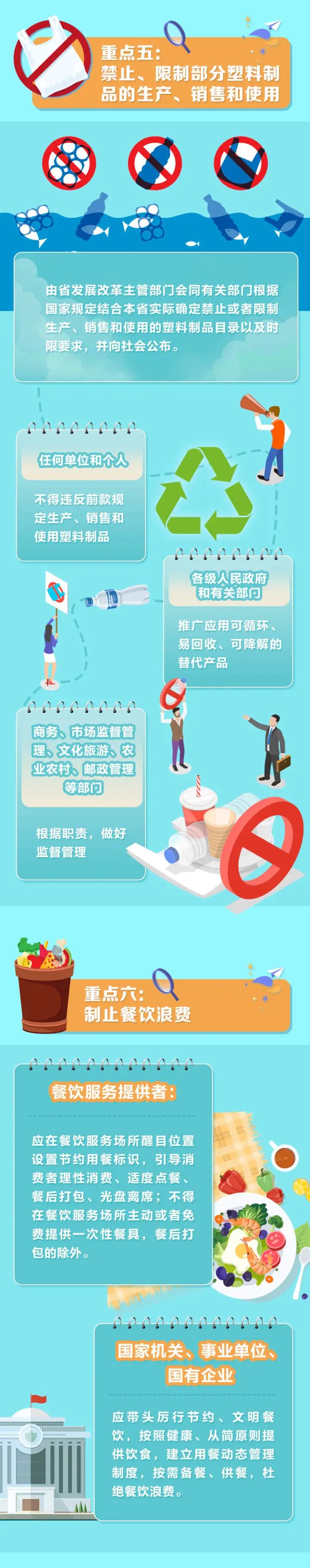 商務(wù)、市場監(jiān)督管理、文化旅游、農(nóng)業(yè)農(nóng)村、郵政管理等部門應(yīng)當(dāng)按照國家和省規(guī)定的職責(zé),做好禁止、限制生產(chǎn)、銷售和使用塑料制品的監(jiān)督管理。
