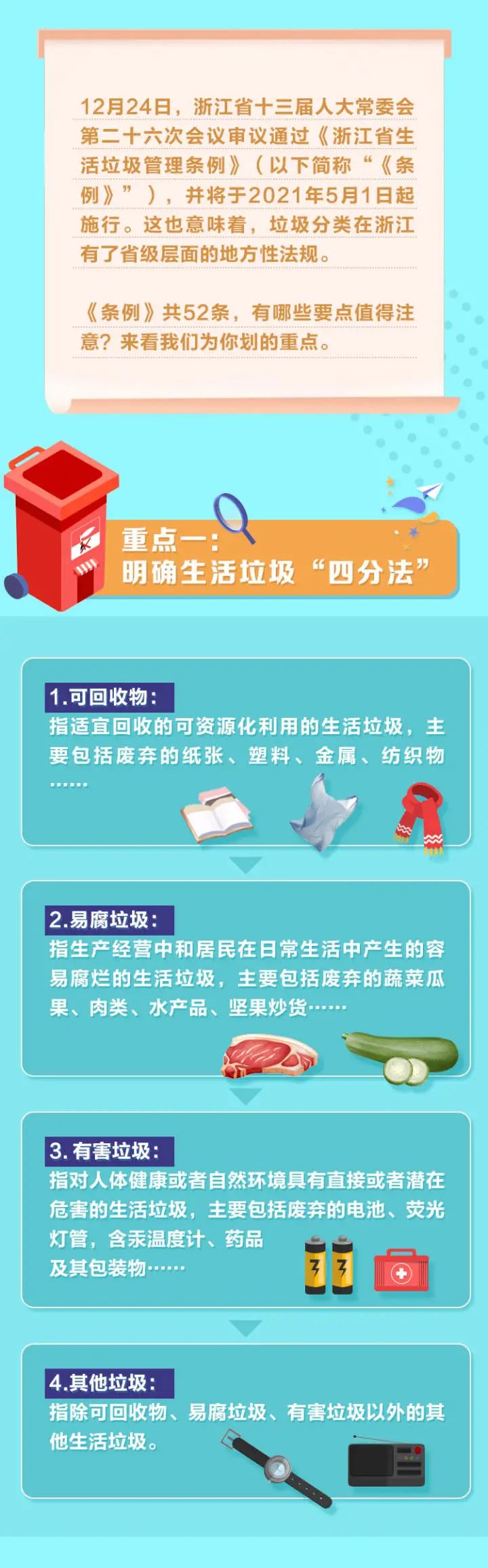 第五十二條 本條例自2021年5月1日起施行。浙江省人民政府發(fā)布的《浙江省城鎮(zhèn)生活垃圾分類管理辦法》同時(shí)廢止。