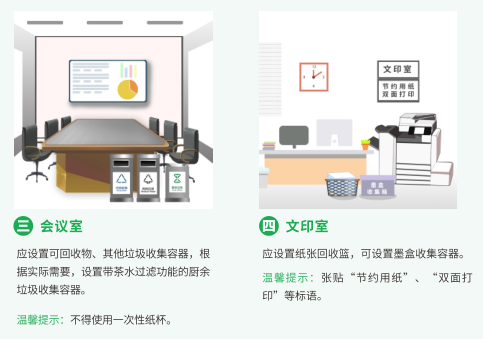機關(guān)企事業(yè)單位、工業(yè)園區(qū)、商務(wù)寫字樓要發(fā)揮生活垃圾源頭減量示范作用,三份指引里明確提倡綠色辦公,優(yōu)先采購可循環(huán)利用的產(chǎn)品,減少使用一次性辦公用品,推廣無紙化辦公,紙張盡量雙面書寫或雙面打印。另外會議室貼合實際設(shè)置帶茶水過濾功能的廚余垃圾收集容器,著重提示不得使用一次性紙杯。