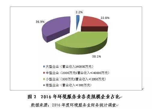 同時(shí),因環(huán)境服務(wù)業(yè)發(fā)展態(tài)勢(shì)向好且門檻較低而受到社會(huì)資本追捧,一些在傳統(tǒng)行業(yè)嚴(yán)重虧損或被迫退出的企業(yè)轉(zhuǎn)而進(jìn)入環(huán)境服務(wù)領(lǐng)域。從統(tǒng)計(jì)結(jié)果看,2016年,大型企業(yè)(以營(yíng)業(yè)收入劃分)超過百家,但占比較上年下降0.2%,小微企業(yè)占比較上年小幅上升1%,達(dá)到75%。環(huán)境服務(wù)業(yè)仍以小微型規(guī)模經(jīng)濟(jì)單位為主體,行業(yè)分散的狀況未見明顯改善。