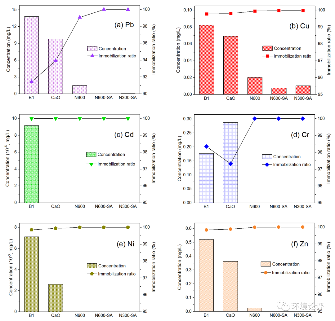 對使用n-Al/CaO固化穩(wěn)定化后的樣品,采用HJ300-2007醋酸緩沖溶液法進(jìn)行浸出實驗,結(jié)果如圖所示。經(jīng)過固化穩(wěn)定化后各種重金屬的浸出濃度都顯著下降,n-Al/CaO材料效果明顯優(yōu)于未經(jīng)固化及氧化鈣固化。對銅、鋅、鉻、鎘、鎳、鉛六種重金屬元素的固定效率可達(dá)99.9%,在最優(yōu)工藝條件下浸出濃度均可穩(wěn)定控制在生活垃圾填埋場入場要求以下。其中,使用N600SA的實驗組各項結(jié)果均為最優(yōu)。