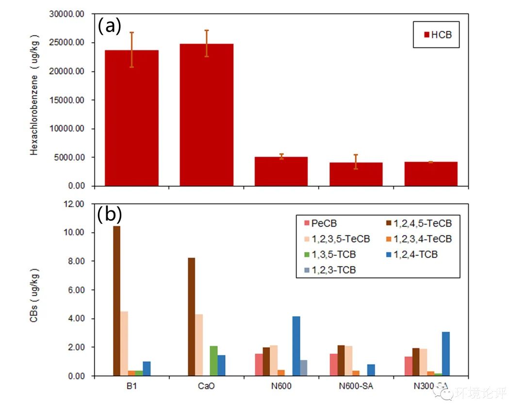 對實驗組的六氯苯及其他氯苯的總量進(jìn)行測試分析,結(jié)果如圖5所示,可見n-Al/CaO對于氯代有機物的去除有較為顯著的效果。相比于未經(jīng)處理的飛灰樣品和使用CaO進(jìn)行處理的對照組,實驗組的六氯苯及氯苯類物質(zhì)總量均有顯著的下降,在最佳實驗組N600SA中超過82.43%的六氯苯被降解去除。