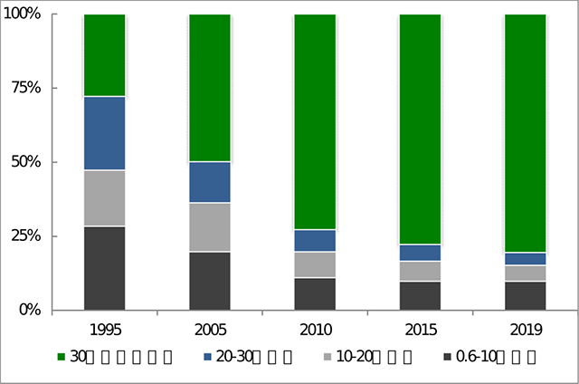 結(jié)構(gòu)調(diào)整成效明顯,資源能源利用效率逐步提升。按照相關(guān)政策要求,火電行業(yè)繼續(xù)加大結(jié)構(gòu)調(diào)整力度,提高資源能源利用效率。2019年共關(guān)停淘汰約2000萬千瓦火電小機(jī)組,30萬千瓦及以上機(jī)組裝機(jī)占比從2015年的77.8%提升至80.5%。行業(yè)平均供電煤耗從2015年的315克/千瓦時(shí)降至306.4克/千瓦時(shí),平均發(fā)電水耗從2015年的1.40千克/千瓦時(shí)降至1.21千克/千瓦時(shí)。按全年發(fā)電量估算,行業(yè)煤炭消費(fèi)量約占全國煤炭消費(fèi)總量的49.8%,首次降至50%以下。
