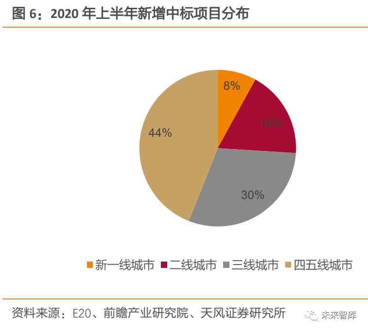 新增產(chǎn)能增速放緩,市場向四五線城市下沉趨勢明顯。2017 年以來,全國垃圾焚燒發(fā)電項目新增投產(chǎn)規(guī)模較大,如2019年新增投產(chǎn)高達(dá) 9.53 萬噸/日。但新增產(chǎn)能增速已由 2017年 53%下降至 2019年 10%。且從 2020 年上半年新增項目區(qū)域分布看,新增的42個垃圾焚燒發(fā)電項目中,一線城市無新增,四五線城市項目數(shù)量占比達(dá) 44%。表明隨著垃圾焚燒行業(yè)快速發(fā)展,一二線城市等經(jīng)濟(jì)較發(fā)達(dá)地區(qū)產(chǎn)能逐漸飽和,行業(yè)整體新增需求增速也有所放緩,市場擔(dān)憂行業(yè)成長性或不可持續(xù)。